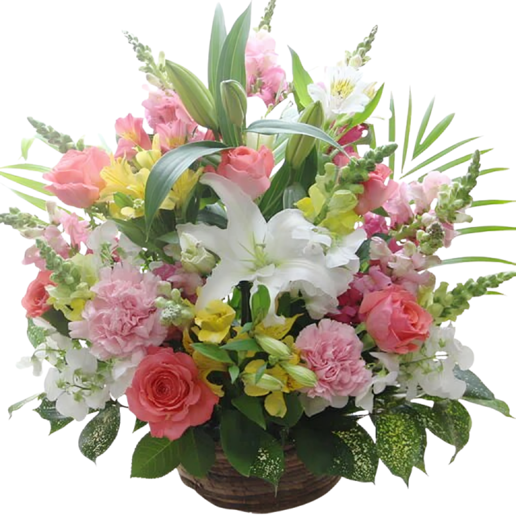 💐 Célébrez l’amour infini d’une mère avec ce bouquet vibrant, alliant blanc pur (innocence), rose tendre (affection) et jaune solaire (joie), arrangé dans un charmant panier en osier ou céramique. Composé de roses, lisianthus délicats, gerberas rayonnants et de gypsophile aérien, cette création incarne la douceur, la force et la lumière que représente une figure maternelle.