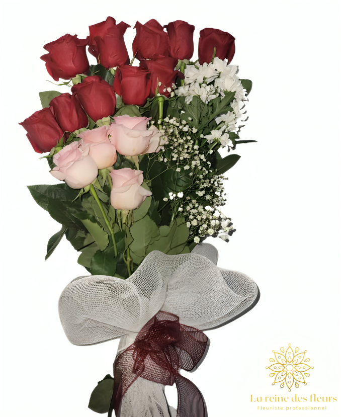 Les roses rouges incarnent la flamme éternelle de la passion, tandis que les roses roses apportent une note de douceur et de gratitude. Ensemble, elles créent une harmonie visuelle et émotionnelle, rehaussée par un feuillage délicat et un emballage raffiné.
