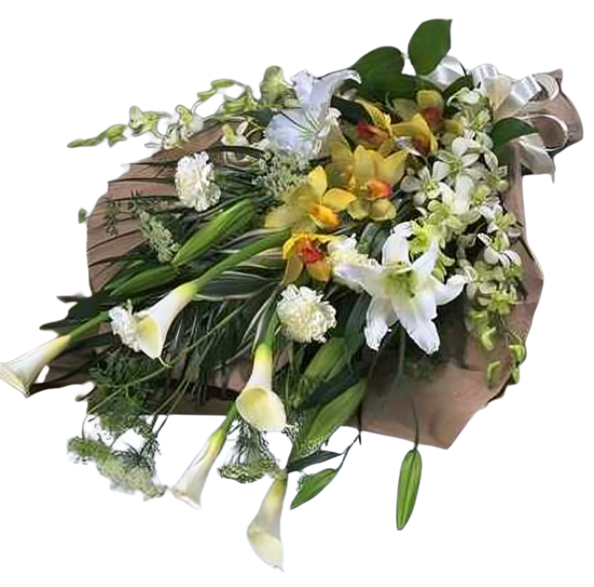 Offrez un bouquet surprise de fleurs blanches et orchidée jaune – idéal pour déclarations, anniversaires ou cadeaux uniques. Création artisanale par La Reine des Fleurs à Québec.