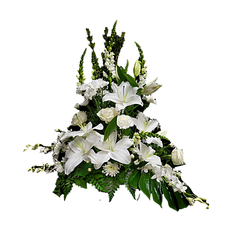 Cette composition florale harmonieuse associe la majesté des lys , la délicatesse des roses , la finesse des œillets et des orchidées , ainsi que la grâce des mufliers et marguerites blanches , le tout sublimé par un feuillage raffiné. Une création élégante et apaisante , parfaite pour une cérémonie funéraire, un hommage commémoratif ou un message de sympathie .