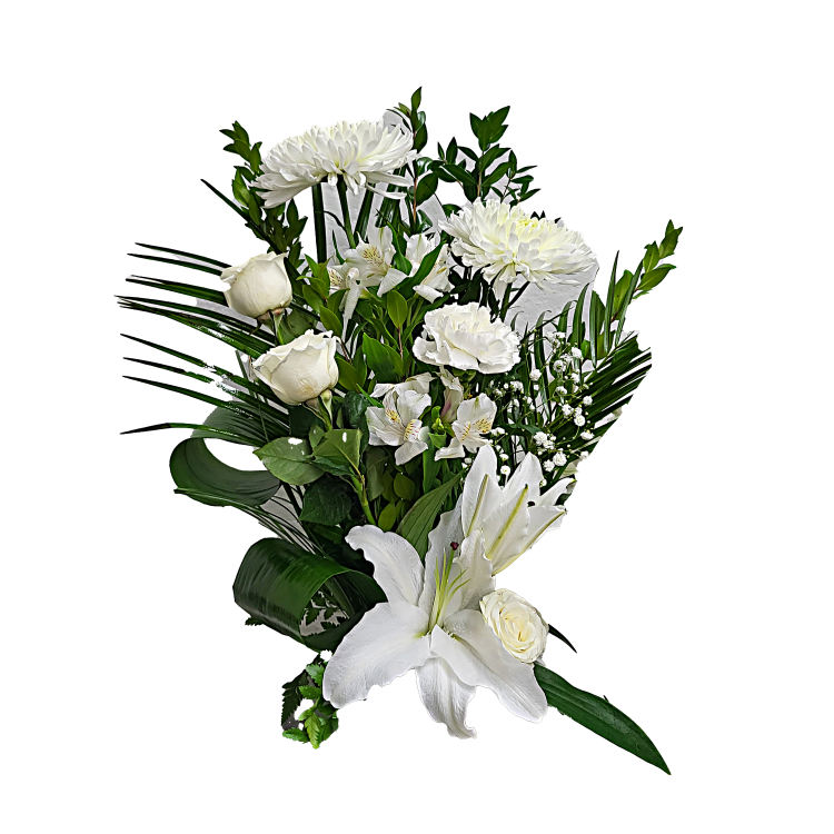 • Composition : Lys blancs majestueux, roses blanches élégantes, chrysanthèmes raffinés, marguerites délicates, feuillage naturel et verdure variée