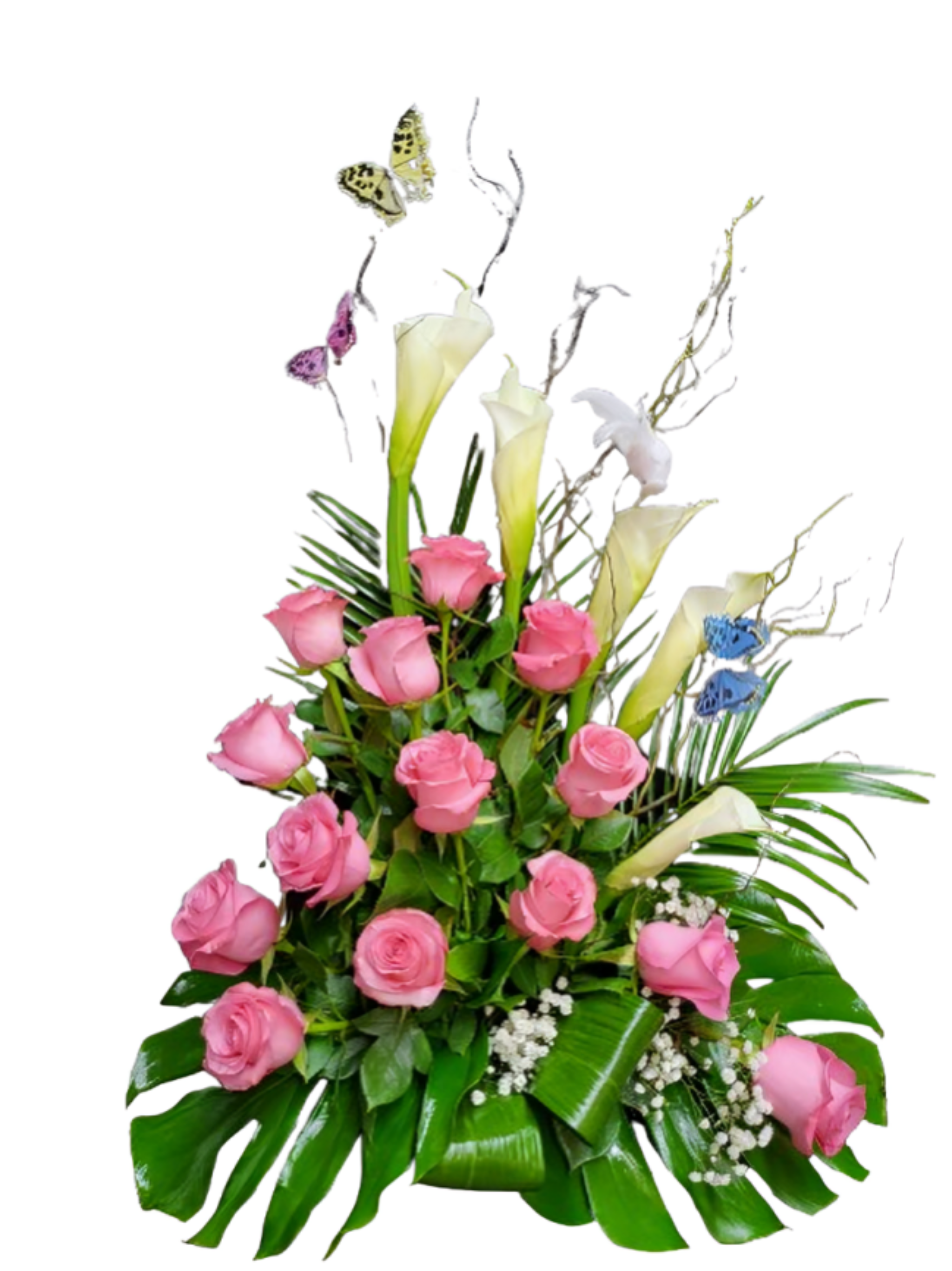 🌿 Alliant élégance contemporaine et douceur intemporelle , cette gerbe florale funéraire moderne met en valeur la délicatesse du rose , symbole de tendresse et d'affection. Elle se compose d' élégantes roses et de mini callas raffinés , sublimés par des accessoires décoratifs soigneusement sélectionnés pour apporter une touche sophistiquée et unique à cet arrangement.
